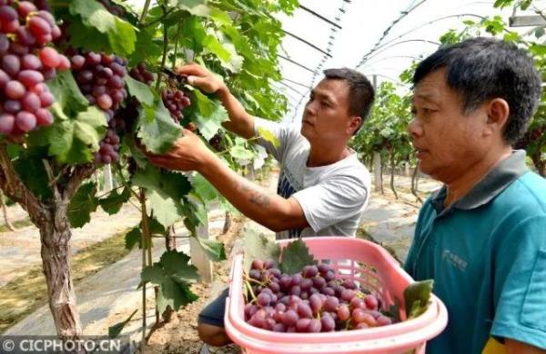 7月1日,河南省夏邑县邮政分公司投递员于亚(左)在帮助北岭镇满园红葡萄种植专业社社员采摘葡萄。