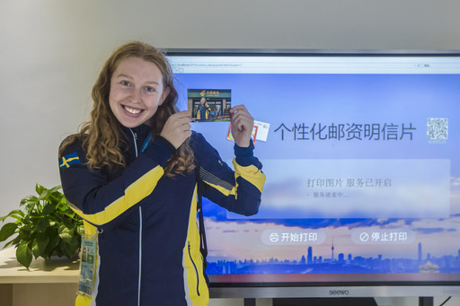 外国运动员展示刚刚打印的个性化明信片。