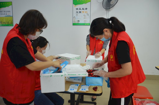 5月中旬,四川茂县的甜樱桃上市。浙江省玉环市邮政分公司积极参与当地市政府开展的消费扶贫助力对口地区脱贫攻坚活动,为茂县甜樱桃拓销路、畅渠道。该分公司采用冷链物流的运输方式,将茂县甜樱桃运到玉环市,再通过同城配送将甜樱桃送到客户手中。5月下旬至6月初,玉环市分公司已配送4批、近6600公斤茂县甜樱桃,助力拓宽茂县优质农产品销售渠道。图为玉环市分公司党员志愿者在配送前检测樱桃品质。 □叶玮  摄影报道