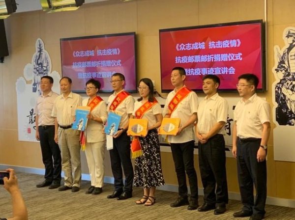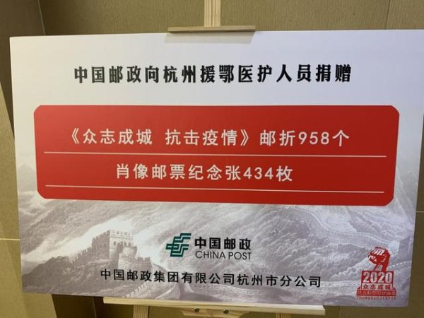 8月20日上午,在杭州邮政分公司大楼的报告厅,由杭州市卫生健康委员会、杭州市市邮政管理局、杭州邮政分公司联合举办《众志成城 抗击疫情》邮折捐赠仪式。杭州邮政分公司向杭州援鄂抗疫医务工作者捐赠《众志成城 抗击疫情》邮票邮折共计958套;肖像邮票纪念张434张。此次捐赠给医务工作者的《众志成城 抗击疫情》纪念邮折,是中国邮政特别发行的邮票,用于铭记中国力量和中国精神,并将邮票发行收入捐献用于救灾抗疫。