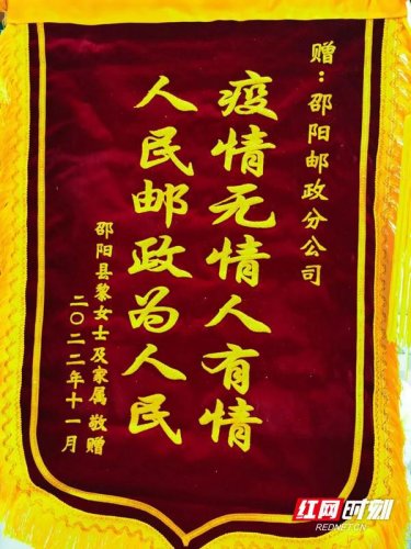 日前,湖南省邵阳市邮政分公司收到一个特殊的包裹,里面紧裹着一面鲜红的锦旗,上面写着“疫情无情人有情,人民邮政为人民”。
