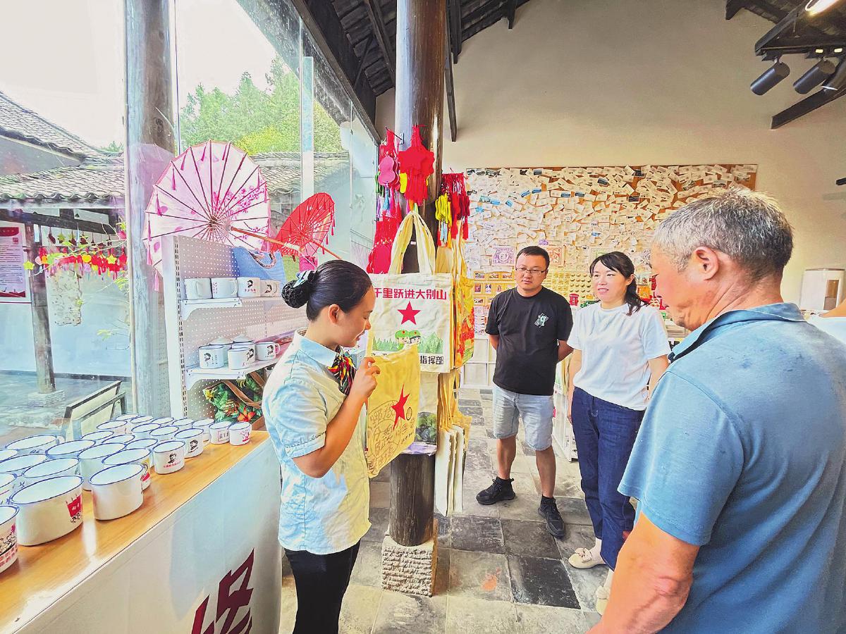 红军邮局工作人员正在向游客介绍各类红色文创产品。