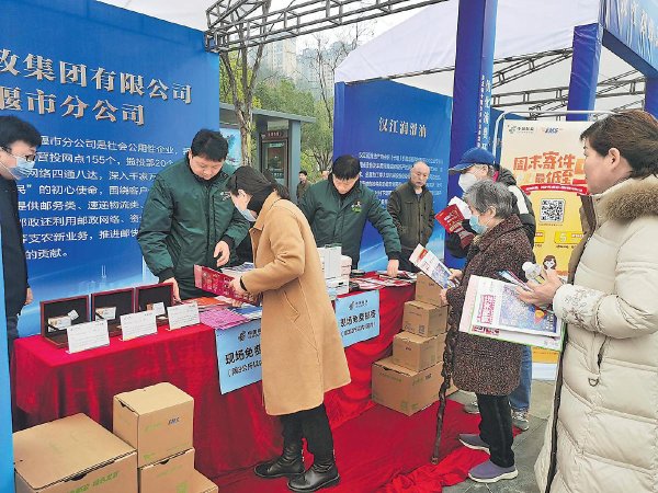 十堰邮政在茅箭区举行的“3·15”宣传服务活动现场设立展台,引导市民体验邮政业务。